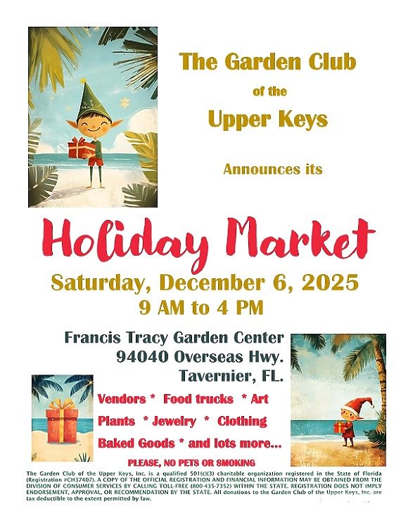 Enjoy a holiday garden marketplace filled with unique vendors, crafts, artisans, baked goods and plants. Event is rain or shine, hosted by Garden Club of the Upper Keys, located within the Francis Tracy Garden Center, mile marker 94 bayside. From 9 a.m. to 4 p.m., free admission.